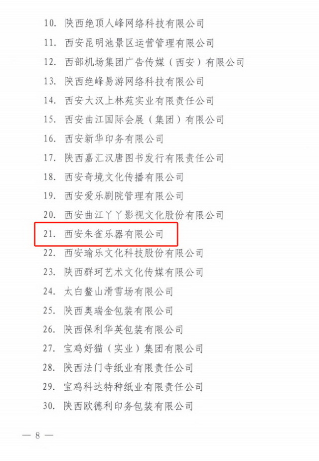 近日,朱雀乐器被陕西省委宣传部、陕西省文化和旅游厅认定为第二届陕西省文化产业“十百千”工程骨干型文化企业。这一殊荣,不仅彰显了朱雀乐器在传统文化产业中的卓越地位和影响力,更展示了在文化创新和产业转型升级中的积极作为。